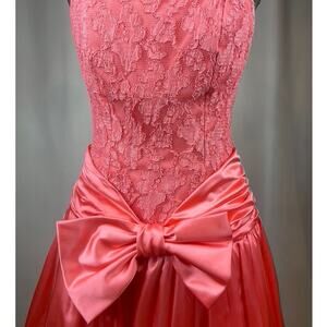 Vintage 80s SCARLETT NITE Pink Salmon Lace Satin Prom Dress (8) Bubble Mini Bow ILGWU USA