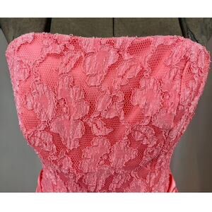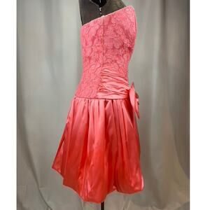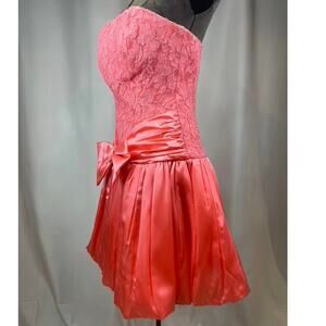 FEATURES/ACCENTS: Vibrant Pinky Salmon Satin with Lace Strapless Bodice. Back Zipper Closure. Pleated, Full Circle Bubble Hem with Large matching Bow at front. ILGWU Union Made in USA
