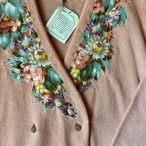 New with tags vintage 1980s satin knit cardigan in women's size large. This rare piece features a pastel floral applique design with delicate jeweled accents, perfect for lovers of dreamy, romantic aesthetics. Made of a silky knit fabric with a relaxed fit, poof sleeves, and double breasted jeweled button front, ideal for layering. The soft color palette and whimsical details make it a standout piece for modern fairycore or coquette-inspired wardrobes. Pristine condition with original tag still attached—never worn and well preserved from the 80s. Pink leans more peach.