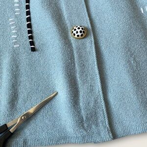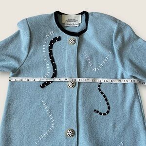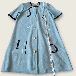Rare vintage 1980s Steve Fabrikant for Neiman Marcus “Corky” sweater shirtdress. Features a powder blue wool blend with bold black trim, whimsical appliqué designs, and oversized polka-dot buttons. Shoulder pads give it that true ‘80s silhouette.