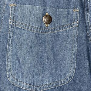 Embrace the timeless style of the Wild West with this vintage Studio 25 Certified Design denim dress. Crafted from high-quality denim material in a medium wash blue color, this maxi dress features a gathered skirt and oversized pockets that add to its prairie and chore-inspired design.