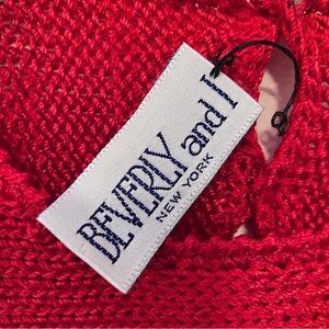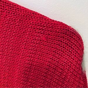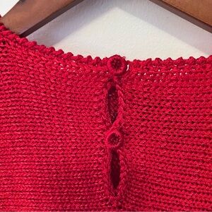 Vintage red sweater with appliqué, sequins, and fur. This sweater has no material or size tag PLEASE CAREFULLY REVIEW MEASUREMENTS. The brand tag is only half tacked in. Small pull on shoulder. Covered buttons at back neck.