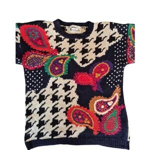 VTG 80s Sweater Knitting Needles Sz L Houndstooth Paisley Sweater Navy