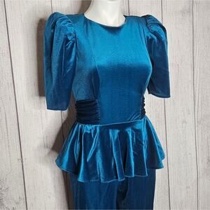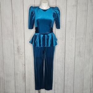 VTG 80s Teal Velvet Peplum Waist Jumpsuit with Open Back, size 5