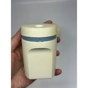 • Beige/off-white plastic with blue snap-on lids