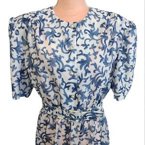 White with blue printed 'floral'. Matching, detachable, adjustable buckle belt. Short sleeves, attached shoulder pads & puffy shoulders. Cuffs have a cute vintage white pearl button decor. Collared. Front button bodice, with 4 vintage pearl buttons. Stretch elastic mid waist. Frilly full skirt. Super cute!