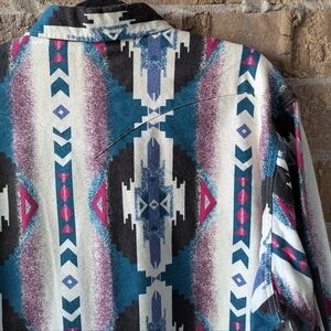 Vintage 1980s southwestern aztec chamois long sleeve snap shirt from Wrangler. 100% cotton. Snap front, snap flap front pockets, snap cuffs. Western yoke. White soft chamois flannel material with blue, teal, black, burgundy and magenta pink allover pattern. Machine washable. Clean. No flaws.