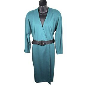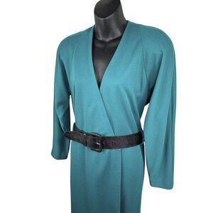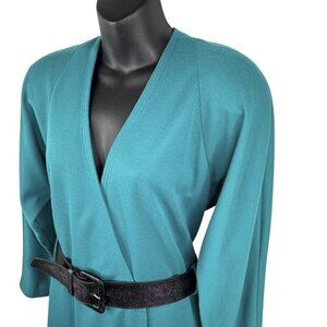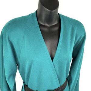 VTG 80s Wrap Midi Dress Belted Long Sleeve V Neck Shoulder Pads Teal Women’s 12