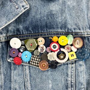 -Color/pattern: medium acid wash blue denim, multicolor buttons