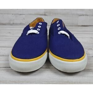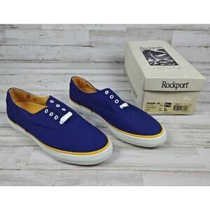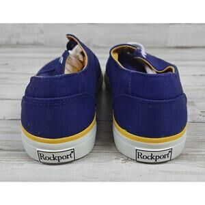 The VTG 80's/90's Rockport "Katy" Navy Canvas Sneakers W5236 are a pair of classic low top sneakers for women with a solid navy blue color and yellow accents. They feature a lace-up closure, standard shoe width, and are made of canvas fabric. These vintage sneakers by Rockport are ideal for activewear, casual wear, or workwear, offering comfort and performance for activities like walking or school. Perfect for the summer, fall, or spring seasons, these sneakers are a stylish and timeless addition to any wardrobe. The box is a tiny bit rough but still in good condition. Not sure if everything that came with the shoes is in the box. The shoes are in new condition.