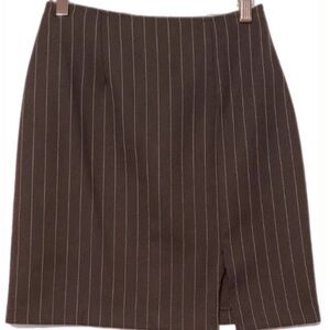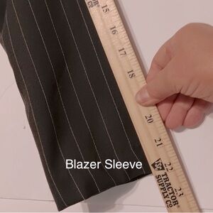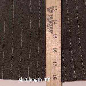 Vintage 80s USA Mark Ferrel NY Gorpcore Pinstripe Career Suit Old Money Business Blazer & Mini Skirt Suit Set Long Sleeve Notch Lapel Black w/ Gray Stripes Tailored Faux Pockets Button Closure 4” Skirt Slit Junior Size 3/4 Lightweight Complimentary Pair of Silver & Black Earrings.
