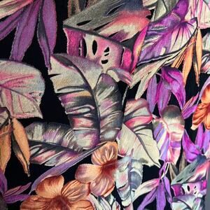 Vintage 1990s stretchy knee-length circle skirt with dark floral Hawaiian print in different shades of purple, cream, and orange on a black background. Perfect skirt for summer!