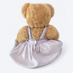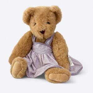 Vintage 90s 1992 Complete Companion Bear, Fully Jointed and Posable with Dress from Vermont Teddy Bear in Tan with Purple Dress. Comes with original hang tags.