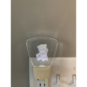 Vintage cute kids teddy bear night light, works great! About 4 inches high. Glass with carved in picture plastic base.