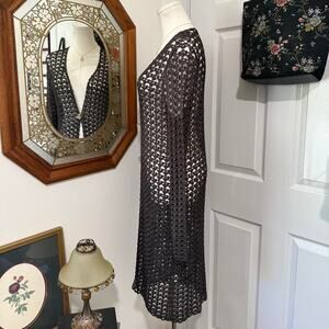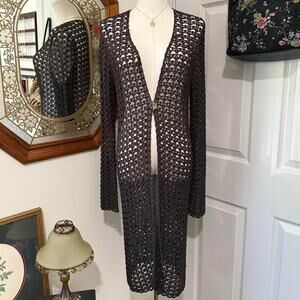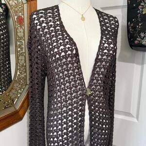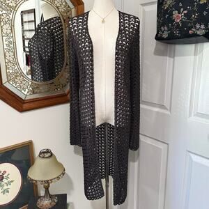 VTG 90s Anne Klein Dark Brown Open Knit Crochet Long Sleeve Duster Cardigan S