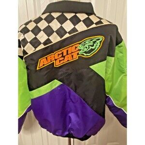 Vintage Arcticwear by Arctic Cat Snowmobile Racing Jacket. Bright, vibrant colors of purple, orange and green, reminiscent of the 90's! And a black and white racing checker pattern. Has embroidered patches on the left chest and right sleeve that says "team Arctic" as well as an embroidered Arctic Cat logo with spellout on the back.