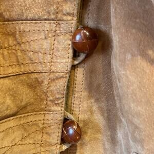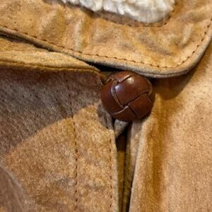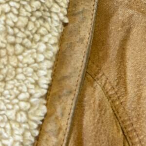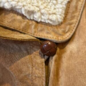 The VTG 90s Avanti Suede Leather Bomber Jacket in size L is a stylish and cozy addition to any wardrobe. This oversized jacket features a sherpa fleece collar for added warmth, making it perfect for casual occasions in the winter months. The beige color and boho look of the jacket give it a unique and retro vibe, while the faux fur accents add a touch of luxury. Made from genuine suede material, this original piece from the 1990s is sure to make a statement wherever you go. Has a couple of minor flaws: general light wear and darkening in places on the suede and open seam in lining--see photos. Please see measurement photo. Overall in quire good condition.