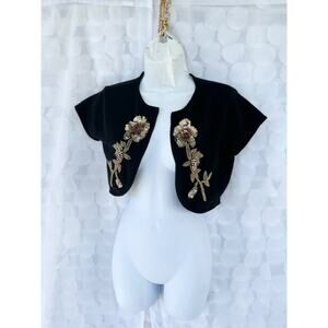 VTG 90's Black Lambs wool Cropped Bolero Sweater Gold Embellished Sequins Party
