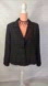 Black, with thin white pin stripes. V neckline, double point collar. Single breasted, with large exaggerated black buttons, closure. Fitted style. Long sleeves, with shoulder pads. Hidden, back slit, vented hem. Fully lined, in black satin. Has stretch to it.