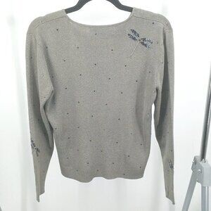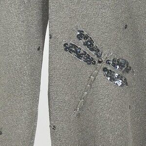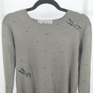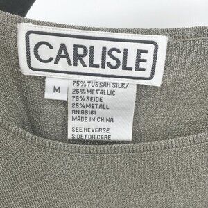 VTG 90s Carlisle Firefly Metallic Shimmer Scoop Neck Silk-Blend Knit Top in size Medium, color Silver. Good used condition with gentle wear: a sequin or two missing, nothing noticeable. This moody knit top features trendy sequined fireflies, a slightly cropped length, mid-weight silk-blend knit fabric, and shallow scoop neckline.