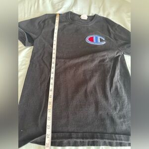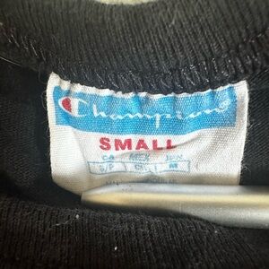 VTG 90s Champion Small Black crew neck tee. Large Embroidered Logo Short Sleeve.
