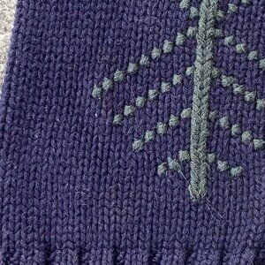 Vintage Chaps Ralph Lauren men's handframe knit sweater in navy blue with multicolor raised embroidered Southwestern-style motifs. Features stars, tree designs, and blanket-inspired accents, all in thick textured embroidery. Classic ribbed crew neckline, cuffs, and hem with a boxy vintage fit. Made in Hong Kong of 100% cotton.