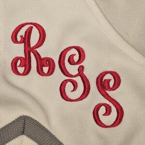 Gray, white, red stripes down sides with zigzag design on top