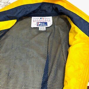 The product is a rare vintage 1990s Cleveland Indians Pro Player windbreaker jacket in size XL, officially licensed by Major League Baseball. This yellow jacket features Chief Wahoo and was sold at a time when players such as Jim Thome, Kenny Lofton, Albert Belle, and Omar Vizquel where on the team, making it a unique and sought-after piece of fan apparel for men who support the Cleveland Indians (Guardians). The jacket represents a nostalgic era in baseball history and is a must-have for any vintage sports memorabilia collector.