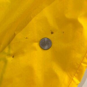 The windbreaker is in very good condition. There are some markings/spots on the jacket. I believe I've highlighted all of them in the pictures. The back of the left sleeve has the majority of the spots. Like white, yellow is hard to keep 100% clean but overall, this jacket is in very good condition.