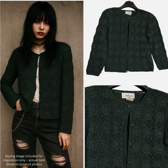 Add a touch of 90s grunge edge to your wardrobe with this vintage Worthington crochet cardigan. Designed in a moody deep green, the allover lace-knit crochet and covered buttons create the perfect layering piece for slip dresses, band tees, or tailored trousers. A true late 80s/early 90s classic with endless styling potential.