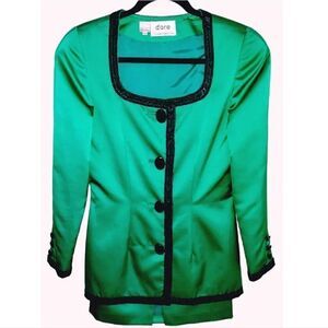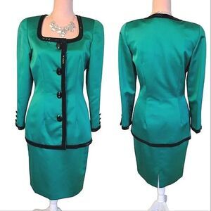 VTG 90s Della Roufogali 2 Piece Green Satin Black Embellished Skirt Suit Size 6