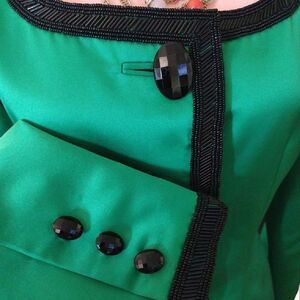 - All bright Designer Emerald Green satin, embellished with Stunning Jet Black beaded detailing & Black exaggerated oval buttons
