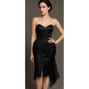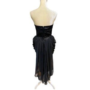 Released as part of a limited licensed fashion collection by L.A. Glo, this rare piece bridges collectible Disneyana and vintage couture. Crafted in the USA, it features a satin strapless corset bodice, sweetheart neckline, and dramatic draped chiffon overlays with a short sheer back train—an unmistakable nod to Breathless Mahoney’s noir allure.