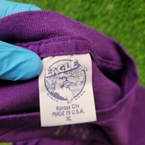PURPLE SHIRT, DREAM CATCHER PRINT, FEATHERS AND ARROWHEADS, SINGLE STITCH HEM, MADE IN USA, 50% COTTON 50% POLYESTER, KANSAS CITY TAG, 1990S ERA, BOX FIT STYLE, RETRO GRAPHIC TEE