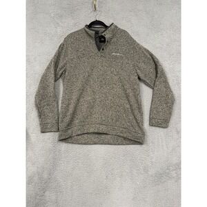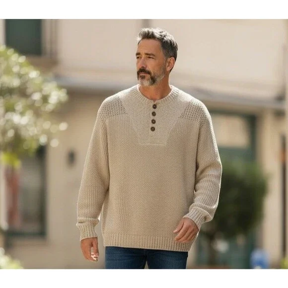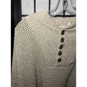 The VTG 90s Eddie Bauer Button Knit 100% Cotton Pullover Sweater XXL is a classic piece of men's clothing from the 1990s, made in the USA by Eddie Bauer. This sweater features a round neckline, long sleeves, and a solid beige color.