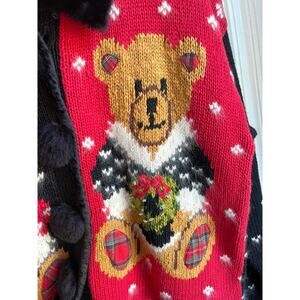 VTG 90s Elana Carello Bear Christmas Cardigan Faux Fur Collar Pom Buttons