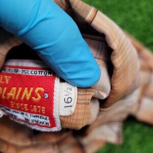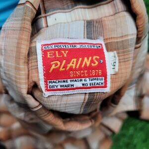 VTG 90s Ely Plains Plaid Pearl Snap Cowboy Shirt Mens L Western Wear Sawtooth Pockets Pointed Yoke Brown Tan Earth Tone Poly-Cotton Blend Southwestern Rockabilly Americana Short Sleeve Button Shirt