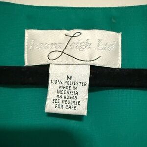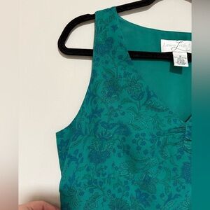 Features a v-neckline with empire waistline; green fabric features a floral design in blue; midi or maxi length