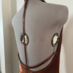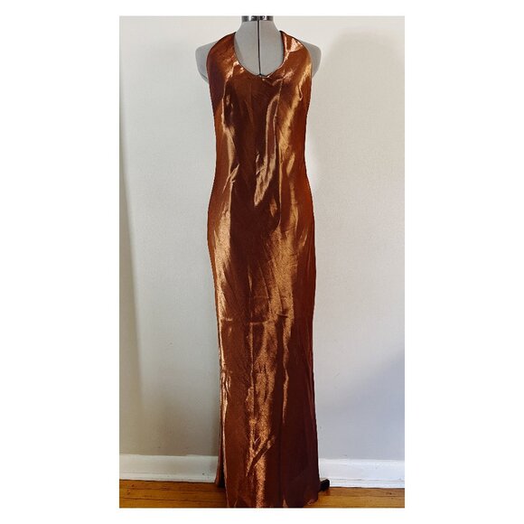 Amazing vintage 90s maxi dress by Geometrie. Women's size 8. Shiny metallic brown fabric lined with black acetate. Halter style scoop neck front that turns into t strap design in the back. Side zip closure. Long maxi with slight a line shape through skirt. Body skimming cut. Minimal 90s style that is super on trend today. Non stretch fabric so check measurements below to ensure a perfect fit. Made in USA.
