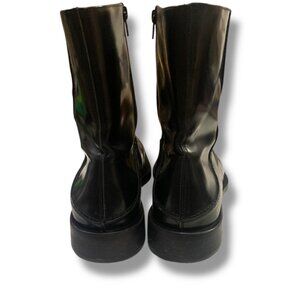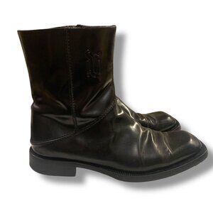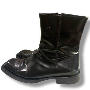 vintage boots, mens designer boots, black leather boots, side-zip boots, designer shoes, size 42 boots, Versace logo boots, classic mens boots, luxury vintage boots, Gianni Versace footwear, durable leather boots, Italian designer boots, timeless mens footwear