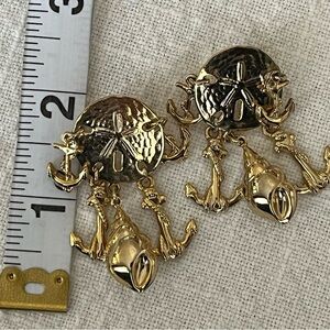 Elegant gold tone earrings featuring anchor, seashell, and sand dollar motifs.