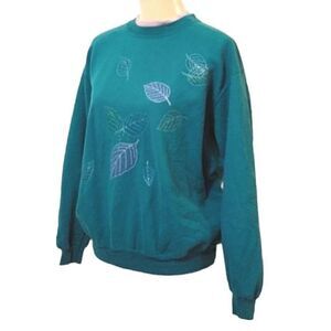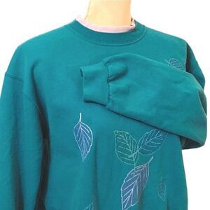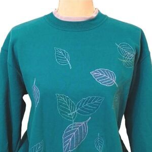 Teal/ green sweatshirt / pullover, with glittery embroidered leaf prints, in purple, blue & green, on both front & back. Double layered, crew neckline (faux undershirt look, in light purple). Long sleeves, ribbed cuffs & hem. Stretchy.