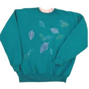 VTG 90s Green Blue Embroidered Leafs Layered Crewneck Pullover Large