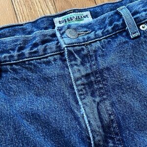Nineties Guess 10001 classic fit straight leg jeans. Medium wash. Zip fly. High rise. Green triangle logo on back pocket.