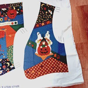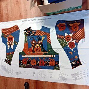 Up for sale is a vintage 90s Cranston Print Works Fabric Craft Panel for the Halloween Vest by Leslie Beck, titled "Which Witch & The Who?" This uncut, cotton print panel includes instructions needed to sew a festive vest in adult sizes Small, Medium, or Large. The design is a patchwork of Halloween imagery, including jack-o'-lanterns, ghosts, and two witches with their brooms and cauldron. The back panel features the quote: "There is magic in the night When Pumpkins glow with Candle Light." This would make a great project for a quilter or crafter looking for a unique holiday vest. It is in good shape with no stains or holes. Just an FYI, you will need to supply your own lining fabric and buttons to complete the project. Thanks for looking!