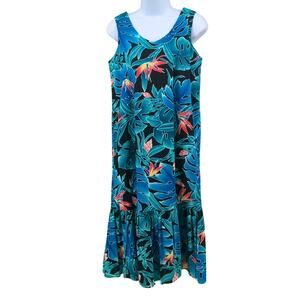 Channel classic island style with this vintage Hilo Hattie Hawaiian dress, made in Hawaii from 100% cotton. The vibrant tropical floral print in bold blues and greens captures effortless summer elegance. Perfect for beach vacations, luau parties, or resort evenings, this lightweight maxi pairs beautifully with sandals or wedges. Ideal for spring and summer wear or as a relaxed, statement piece for travel and coastal events.