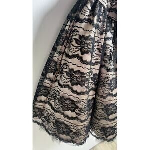 This vintage 90s Jessica McClintock Gunne Sax dress features a strapless design with a black lace overlay, giving it a mini length and a fit & flare style. Perfect for various occasions like formal events, parties, weddings, or even traveling, this dress is lined and has a corset closure for a flattering fit. Made of polyester and nylon, this floral patterned dress exudes a rockabilly, retro, and elegant vibe, making it a standout piece for any wardrobe. You'll love the attention to detail and the classic yet edgy look of this timeless dress.