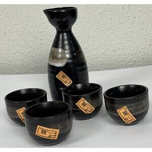 Authentic vintage 1990s Japanese sake set from Aichi Prefecture. New with tags and unused, this traditional Tianmu-style stoneware set features a rich black and brown reactive glaze. Includes one decanter and four matching sake cups. A beautiful example of Japanese ceramic artistry, perfect for collectors of regional pottery, tea ceremony accessories, or traditional Japanese decor. This item is new old stock with tags attached. It has never been used and has been carefully stored since the 1990s. Original box not included.