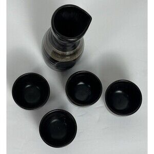 VTG 90s Japanese Tianmu Sake Set Decanter 4 Cups NWT Stoneware Aichi Japan Black