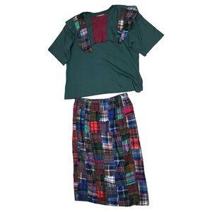 Authentic vintage Jaybird two-piece set featuring a patchwork plaid skirt and coordinating forest green top with plaid shoulder accents and a burgundy inset detail. Made from 100% cotton, this set captures a rustic, artsy, cottagecore vibe with its bold multicolor patchwork and comfortable silhouette.